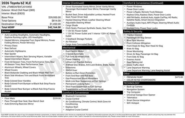37. EPA-estimated 130 combined MPGe for 2026 bZ XLE FWD; 131 combined MPGe for 2026 bZ XLE FWD Plus; 120 combined MPGe for 2026 bZ XLE AWD; 125 combined MPGe for 2026 bZ Limited FWD; 117 combined MPGe for 2026 bZ Limited AWD. MPGe is the EPA-equivalent of gasoline fuel efficiency for electric-mode operation. Use for comparison purposes only. Your MPGe/miles per kilowatt-hour will vary for many reasons, including your vehicle’s condition and how/where you drive.