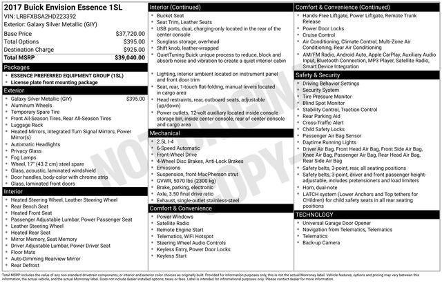 Recent Arrival! 2017 4D Sport Utility Buick Envision Essence Galaxy Silver Metallic FWD 2.5L 4-Cylinder DGI DOHC VVT 6-Speed Automatic BLUE TOOTH, BACKUP CAMERA, 18"" 10-Spoke Polished Aluminum Wheels, 6-Speaker Audio System Feature, Apple CarPlay/Android Auto, Auto-dimming door mirrors, Brake assist, Delay-off headlights, Driver 8-Way Power Seat Adjuster, Electronic Stability Control, Exterior Parking Camera Rear, Front fog lights, Fully automatic headlights, Heated door mirrors, Heated front seats, Heated rear seats, Perforated Leather-Appointed Seat Trim, Power Liftgate, Power passenger seat, Preferred Equipment Group 1SL, Radio: Buick IntelliLink AM/FM Stereo, Rear Parking Sensors, SiriusXM Satellite Radio.22/29 City/Highway MPG Awards: * 2017 IIHS Top Safety Pick+ with optional front crash prevention * 2017 IIHS Top Safety Pick+ with optional front crash prevention and specific headlights * 2017 KBB.com Brand Image Awards 02/28/2026