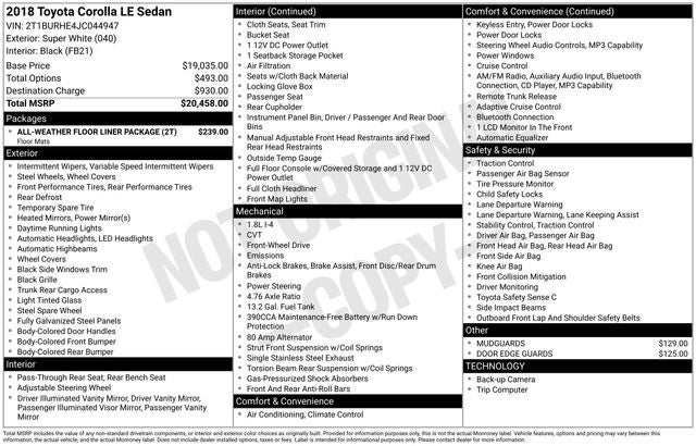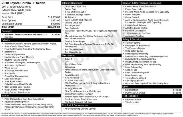 Recent Arrival! CARFAX One-Owner. 2018 4D Sedan Toyota Corolla LE White FWD 1.8L I4 DOHC CVT SUNROOF, BLUE TOOTH, ABS brakes, Active Cruise Control, Auto High-beam Headlights, CD player, Electronic Stability Control, Fabric Seat Trim, Heated door mirrors, Illuminated entry, Low tire pressure warning, Radio: Entune Audio w/6.1"" Screen, Remote keyless entry, Traction control, Wheels: 16"" x 6.5"" Wide Vent Steel.28/36 City/Highway MPG Awards: * 2018 KBB.com Best Resale Value Awards * 2018 KBB.com 10 Most Awarded Brands 04/04/2026