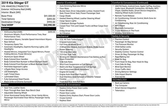 Recent Arrival! Priced below KBB Fair Purchase Price! Clean CARFAX. 2019 4D Sedan Kia Stinger GT HiChroma Red AWD 3.3L V6 8-Speed Automatic BLUE TOOTH, BACKUP CAMERA, Apple CarPlay & Android Auto, Auto-dimming Rear-View mirror, Brake assist, Delay-off headlights, Electronic Stability Control, Front reading lights, Fully automatic headlights, Heated Front Bucket Seats, Heated steering wheel, Leather Seat Trim, Power driver seat, Power passenger seat, Power steering, Radio: AM/FM/MP3/HD/SiriusXM Audio System, Remote keyless entry, Speed control, Speed-Sensitive Wipers, Spoiler, Turn signal indicator mirrors, Variably intermittent wipers, Wheels: 19"" x 8J Front & 19"" x 8.5J Rear Alloy.Awards: * 2019 KBB.com 10 Best Road Trip Cars 02/03/2026