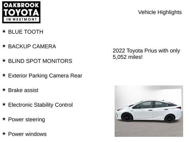 Recent Arrival! Priced below KBB Fair Purchase Price! Clean CARFAX. Certified. 2022 5D Hatchback Toyota Prius Nightshade White AWD 1.8L 4-Cylinder DOHC 16V VVT-i Continuously Variable (ECVT) BLUE TOOTH, BACKUP CAMERA, BLIND SPOT MONITORS, Apple CarPlay/Android Auto, Auto High-beam Headlights, Auto-dimming Rear-View mirror, Brake assist, Delay-off headlights, Electronic Stability Control, Exterior Parking Camera Rear, Heated door mirrors, Heated Front Bucket Seats, Heated steering wheel, Power steering, Power windows, Radio: Audio Plus, Rain sensing wipers, SofTex Seat Trim.Toyota Gold Certified Details: * Powertrain Limited Warranty: 84 Month/100,000 Mile (whichever comes first) from TCUV purchase date * Roadside Assistance * 160 Point Inspection * Transferable Warranty * Warranty Deductible: $0 * Vehicle History * Limited Warranty: 12 Month/12,000 Mile Limited Comprehensive Warranty: 12 Month/12,000 Mile (whichever comes first) from certified purchase date * Roadside Assistance for 7 Year / 100,000 Mile. Standard New-Car Financing Rates Available. Warranty honored at over 1,400 Toyota dealers in the continental U.S. & Canada. Trade-ins accepted. Trouble-free handling of your transaction, including DMV paperwork51/47 City/Highway MPG 02/26/2026