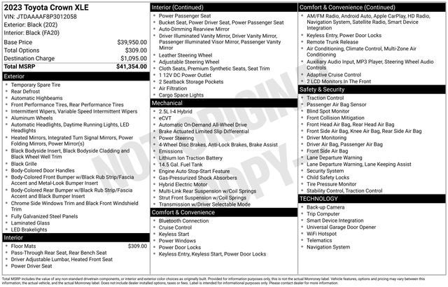 Recent Arrival! Clean CARFAX. CARFAX One-Owner. 2023 4D Sedan Toyota Crown XLE Black AWD 2.5L 4-Cylinder DOHC CVT LEATHER SEATS, 4-Wheel Disc Brakes, 8-way Adjustable Heated Front Seats, ABS brakes, Alloy wheels, Apple CarPlay/Android Auto, Exterior Parking Camera Rear, Garage door transmitter: HomeLink, Power driver seat. Odometer is 18790 miles below market average!42/41 City/Highway MPG 02/25/2026