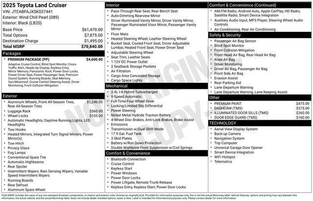 Land Cruiser Premium Package - 14-speaker JBL Premium Audio including Subwoofer & Amp, Illuminated Entry, Power Moonroof w/Sunshade, Center Console Cool Box, Digital Rearview Mirror, Qi-Compatible Wireless Charging, Leather-Trimmed Memory Driver's Seat, Power Front Seats, Head-Up Display (HUD), Lane Change Assist (LCA), Front Cross-Traffic Alert (FCTA), Digital Key (req. Remote Connect Trial/Subscription) and Traffic Jam Assist (req. Drive Connect Trial/Subscription). 1yr Trials included, 4G Network Dependent.